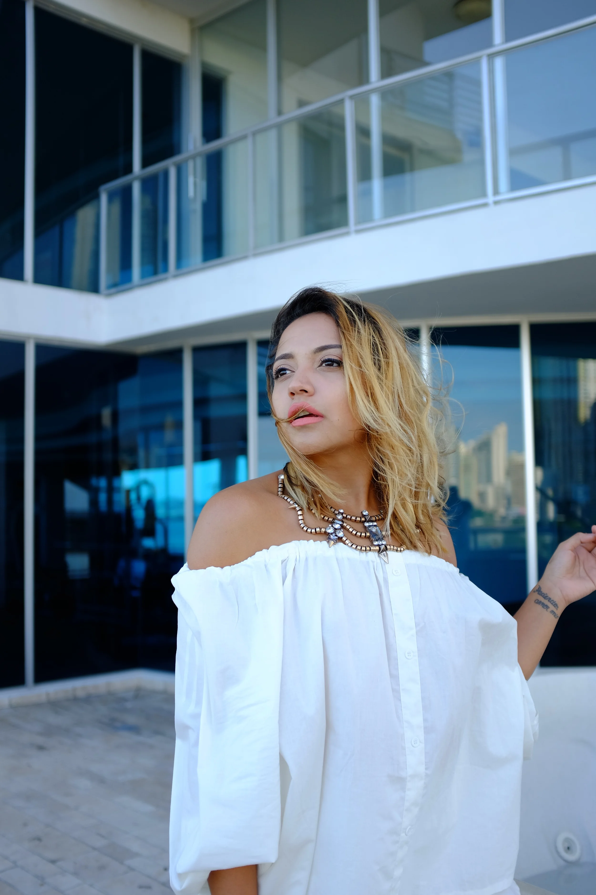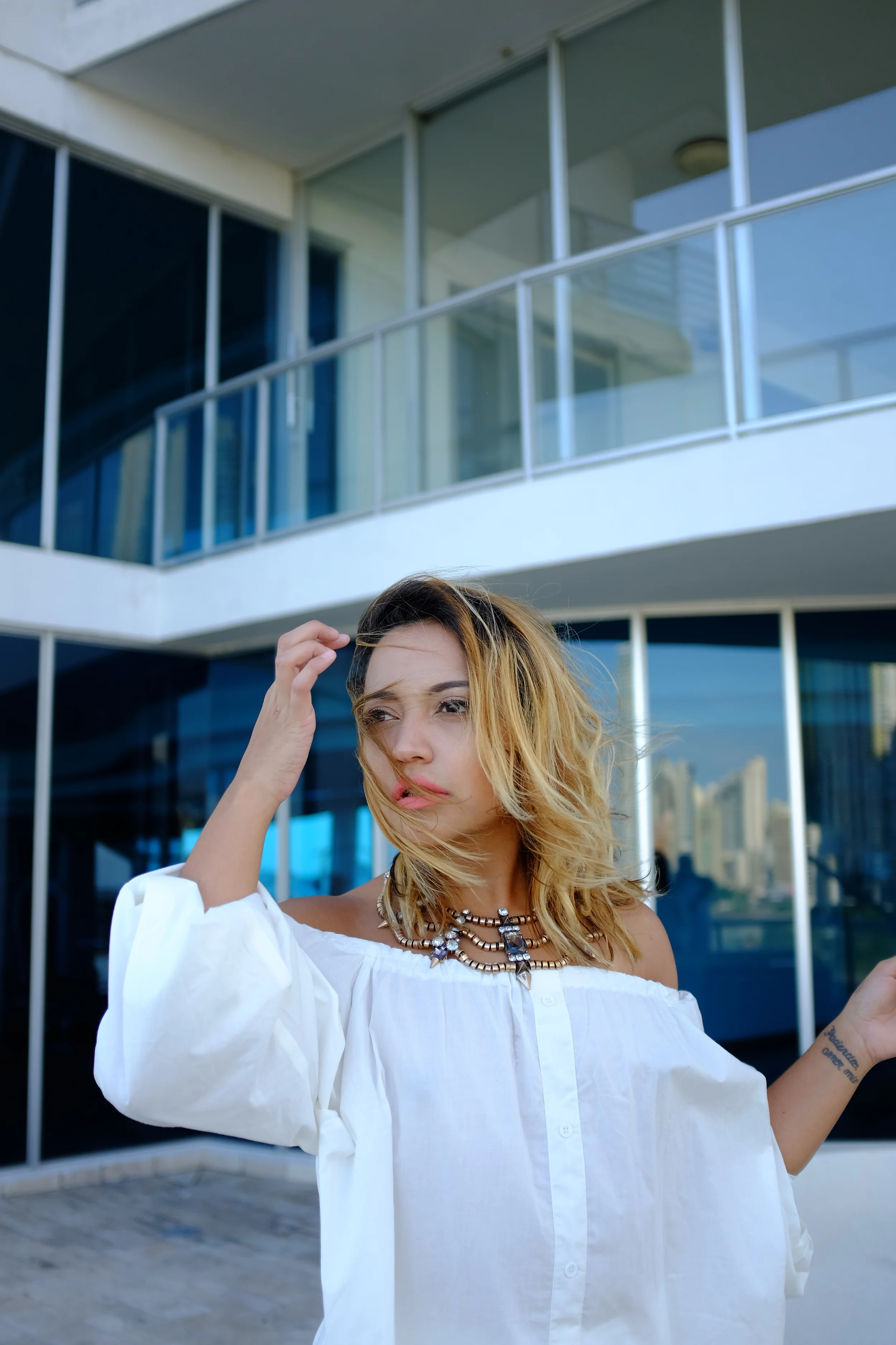La combiné con una falda trompeta blanca para salir de lo usual y este es el resultado. Además poder usarse con todo, puedes jugar con los accesorios, ya que tanto un collar grande como aretes se van a lucir con una blusa como esta.