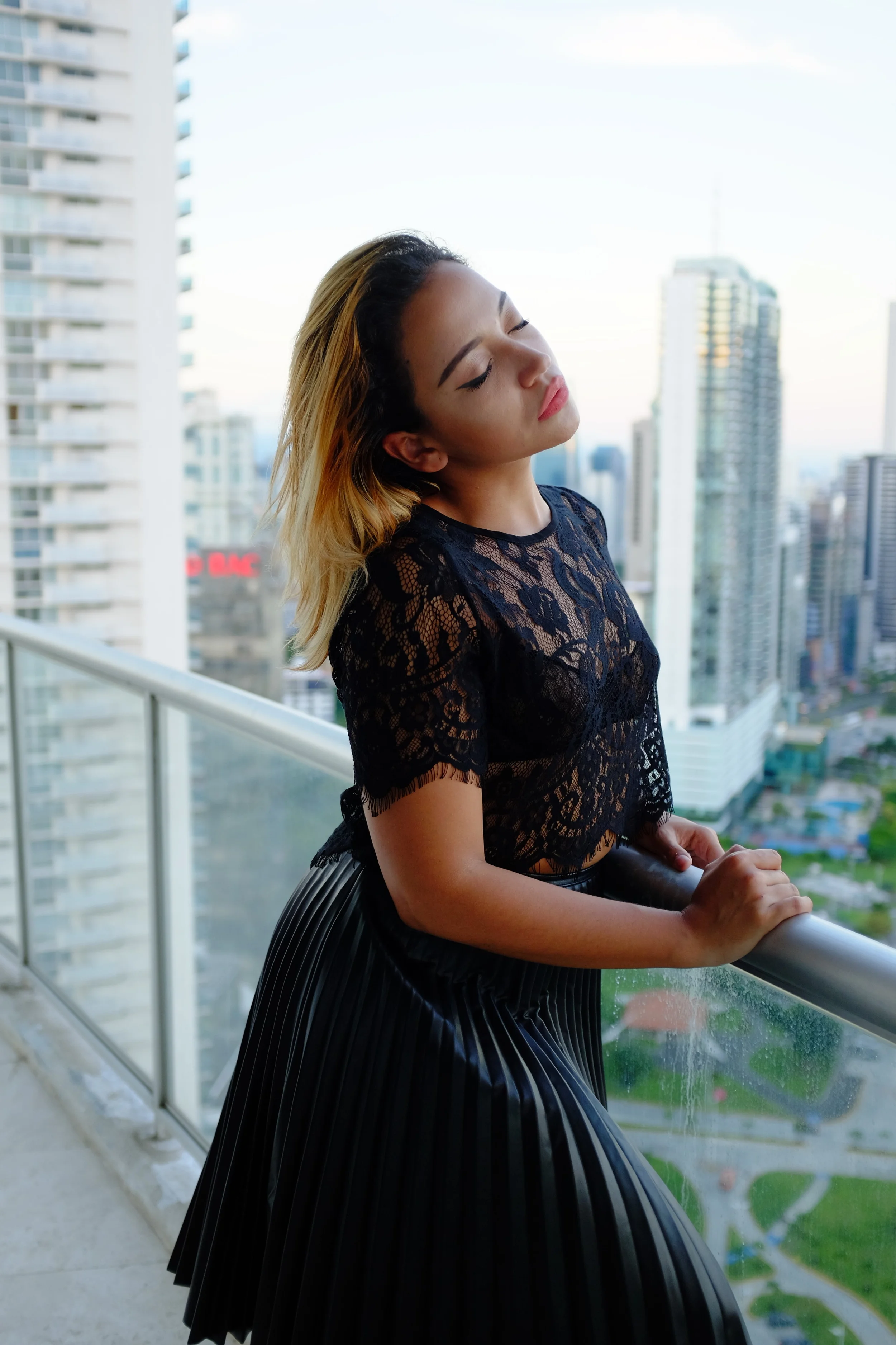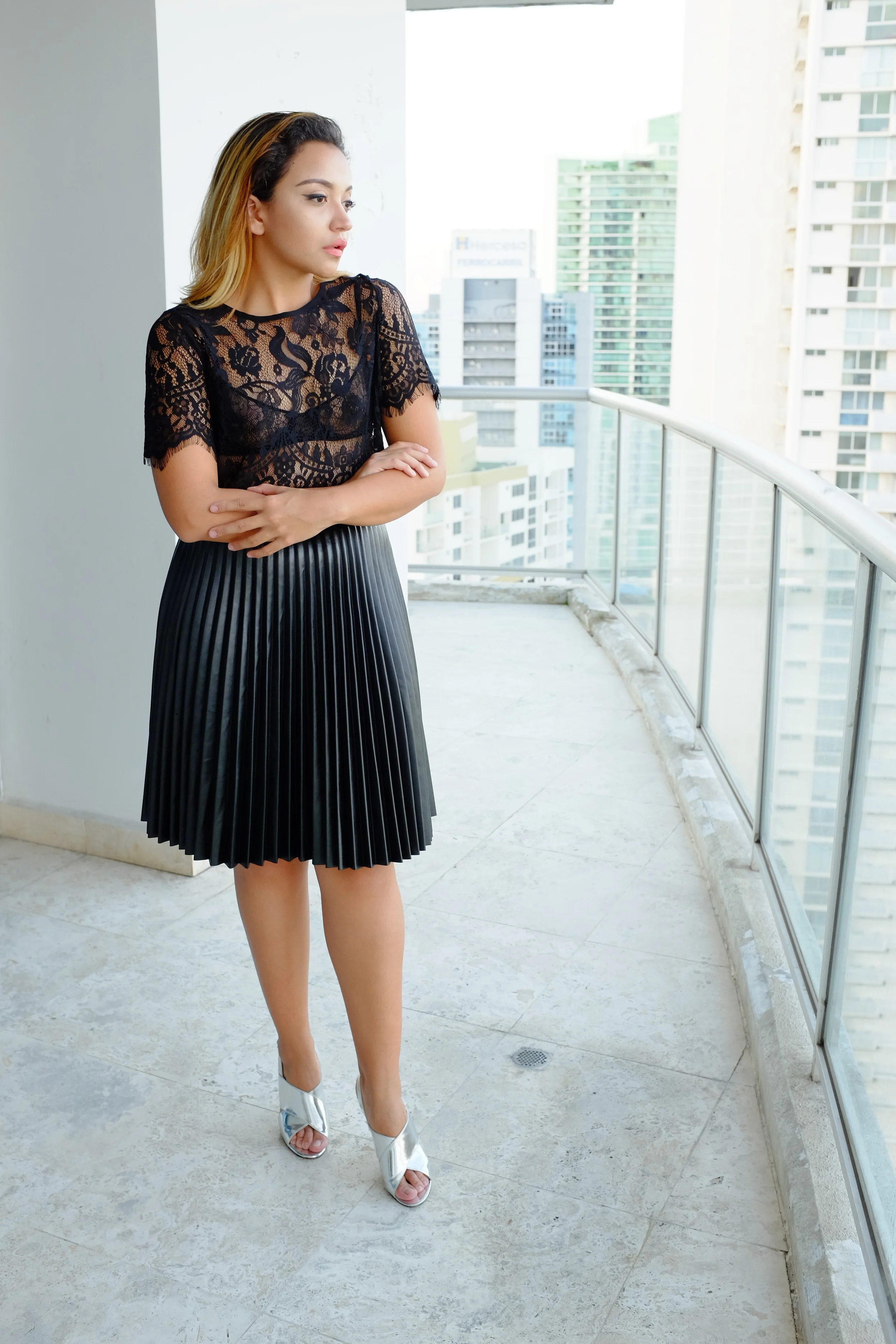 Este outfit es el ejemplo perfecto de esta teoría. En primer lugar, y como siempre digo, el cuero es una tela que tiene mucha personalidad, e inmediatamente hace que una pieza de vestir tradicional se convierta en divertida. En este caso, esta falda Medi hasta media pierna es una opción ideal para ir a la oficina o vestir de una manera más formal, sin caer en lo aburrido. Como yo soy yo, quise enseñar piel de una manera muy sutil con un top de encaje. Yo usé ropa interior de encaje abajo, pero bien pueden llevar un crop top o un bra del mismo tono para cubrirse más.