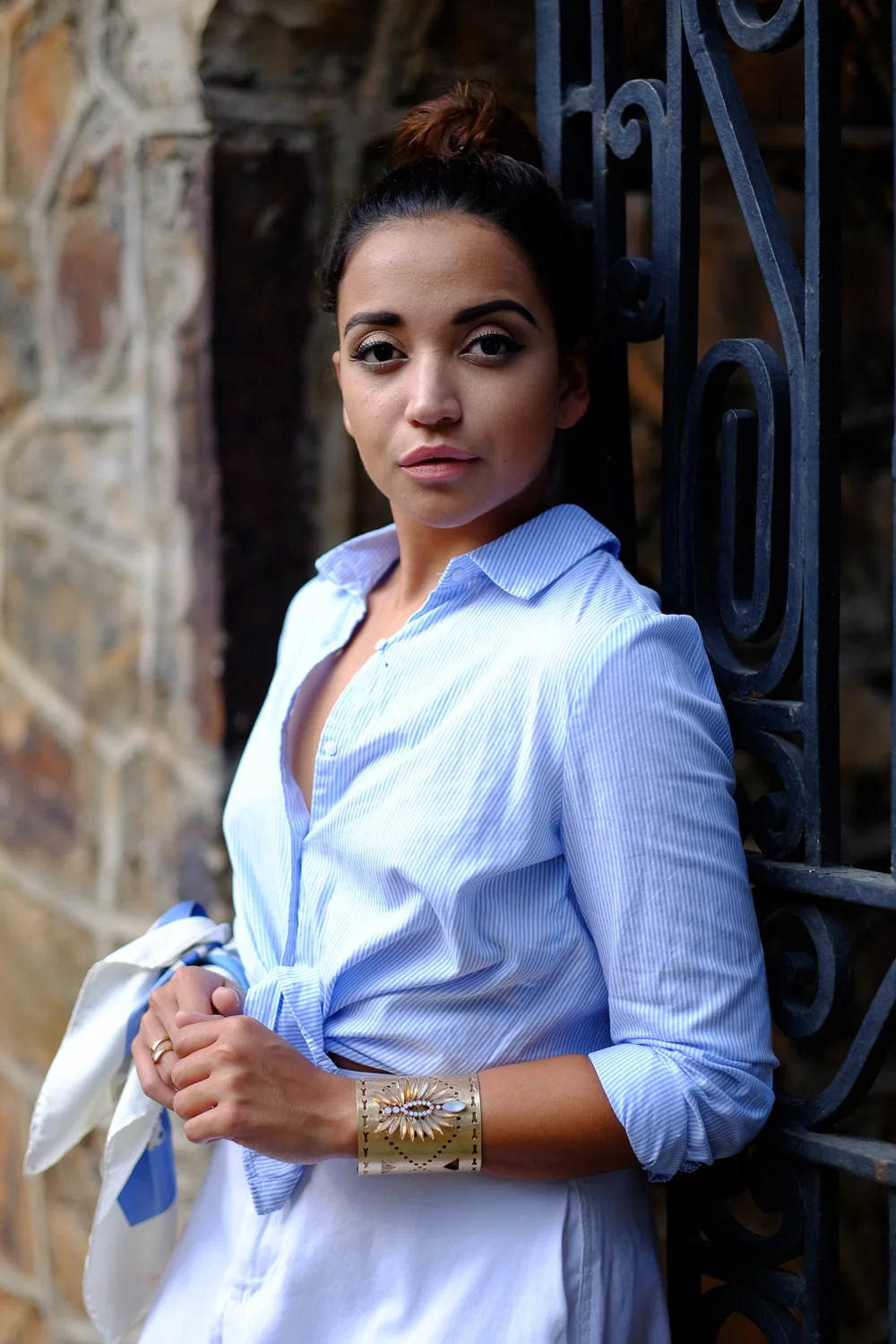 Semanas después y pensando en que outfit usar para el blog, me acordé de las bufandas de mi madre y quise hacer un look muy preppy con una de mis favoritas. Antes de acordarme de esta famosa foto y de todos los artículos que vinieron después, me había puesto esta bufanda Cartier de mi madre en el cuello. Mi pensamiento instantáneo fue: "Para que esto en el cuello funcione tiene que ser más corto... Pareces una aeromoza". Pasando el susto de verme en el espejo y reconocer a cualquier asistente de cabina que trabaje para Copa Air, decidí que Leandra tiene, una vez más, toda la razón. Hay prendas que están destinadas a usarse en otro sitio para los que no fueron diseñados. Dudo mucho que en Carolina Herrera o Cartier piensen en primer lugar que sus bufandas de seda van a terminar dobladas y amarradas en la muñeca de alguien, pero funciona. Vaya que funciona