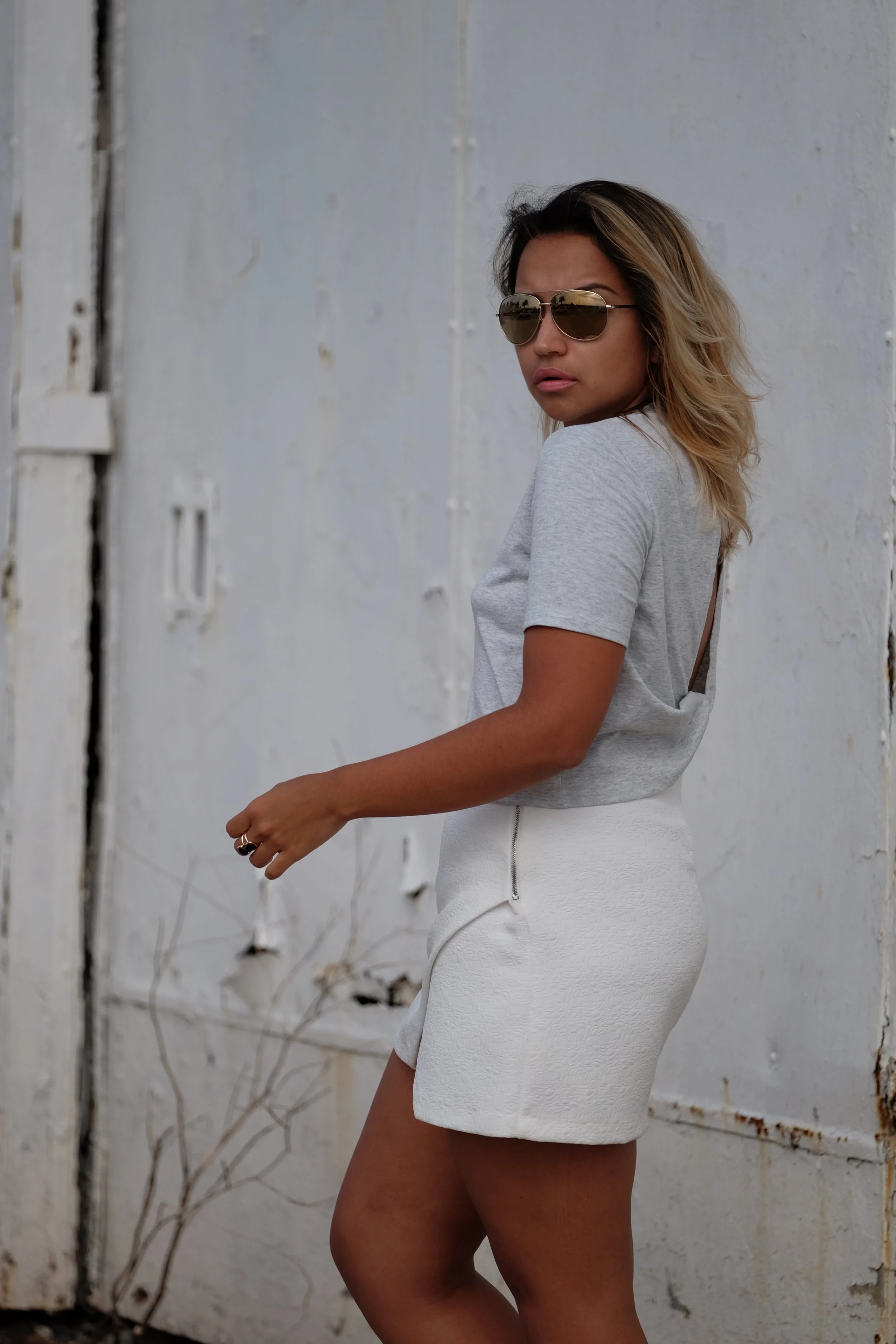 Ese es el caso de este top de jersey que compré en Forever 21, súper combinable y sexy sin ser revelador; y mi falda a la cadera favorita por su estilo geométrico y por ser tan cómoda.