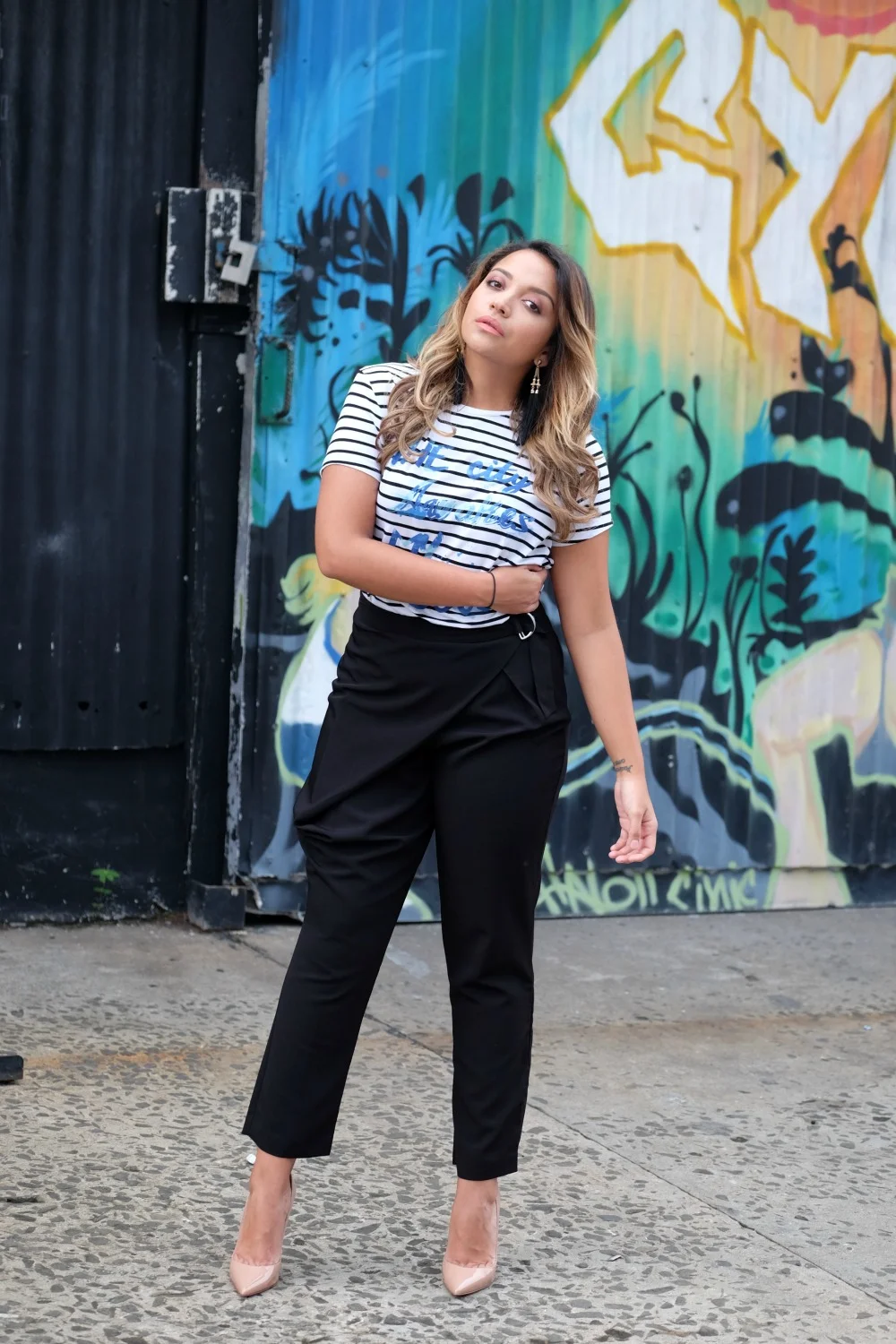 Usar un pantalón negro no tiene porque ser muy serio. Si bien es perfecto para combinar en la oficina, también puede llevarse en un estilo más casual. Esa fue mi opción a la hora de usar este bello top de rayas blancas y negras de BONAGE. Un t-shirt cómodo y muy versátil, que como pueden ver puede verse elegante y súper casual con un par de shorts.