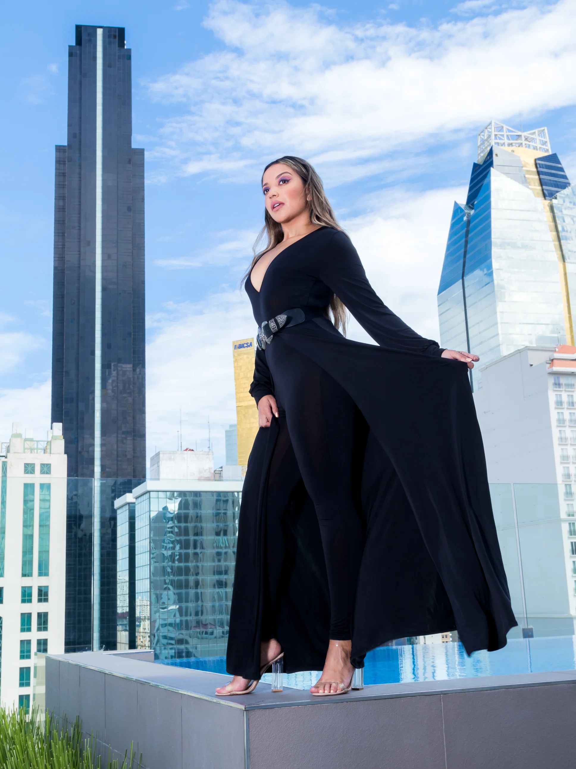Y justo eso es lo que quería expresar con este jumpsuit elástico, pues creo que la cola que sale de la cintura es la manera perfecta para transformar positivamente una prenda básica como lo es un jumpsuit negro de cuello en V. ¿Qué nos impide dar un paso más para darle rienda suelta a la imaginación y usar lo que nos gusta? Esta prenda es la prueba concreta que camisas, blazers entre otras prendas son candidatos fabulosos para utilizar capas.