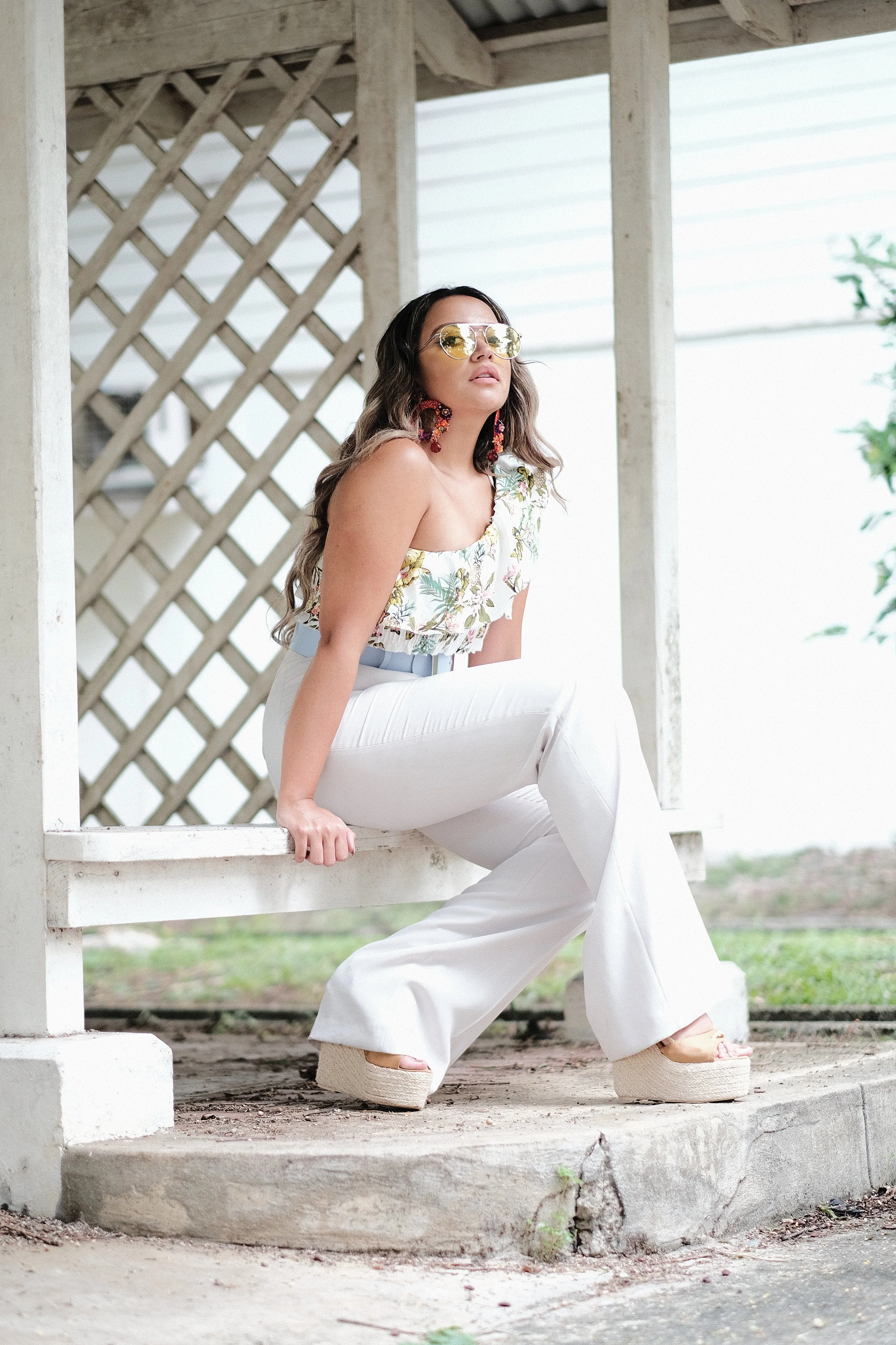 El ejemplo es este look donde los tonos suaves son protagonistas, en especial con este top de flores y hojas espectacular. La clave es combinarlo con accesorios igual de suaves como mis lentes amarillos y pantalón palazo en un tono nude muy delicado.