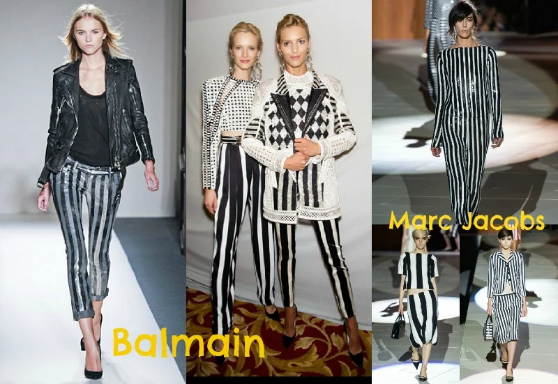 Apenas me dicen rayas verticales, lo primero que viene a mi mente son pantalones pitillo BALMAIN de rayas blanco y negro. Es un clásico de la marca y si algún día usan una prenda así y alguien les grita "¡Qué BALMAIN¡", no se asusten, no es un insulto en alemán o una mentada de madre, es un gran halago. Después de Balmain tenemos a Marc Jacobs, quien es su más reciente colección SS 2013 uso más rayas que carretera de 7 vías.