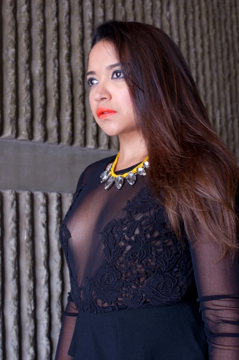 Mi traje, por otro lado, crea un perfecto balance entre piel y tela gracias a la falda negra pegada y la blusa peplum, que disimula cualquier imperfección. Soy defensora en un 100% de amar nuestro cuerpo como es, pero también soy fiel creyente en la estética de una prenda, tengo la filosofía de que hay que vestirse según lo que te acomoda. Para esto solo hace falta tener un poco de sentido común. El largo de la falda de este vestido, el peplum y las mangas largas tapan lo suficiente mi cuerpo como para poder salir sin temor a la calle con este traje.