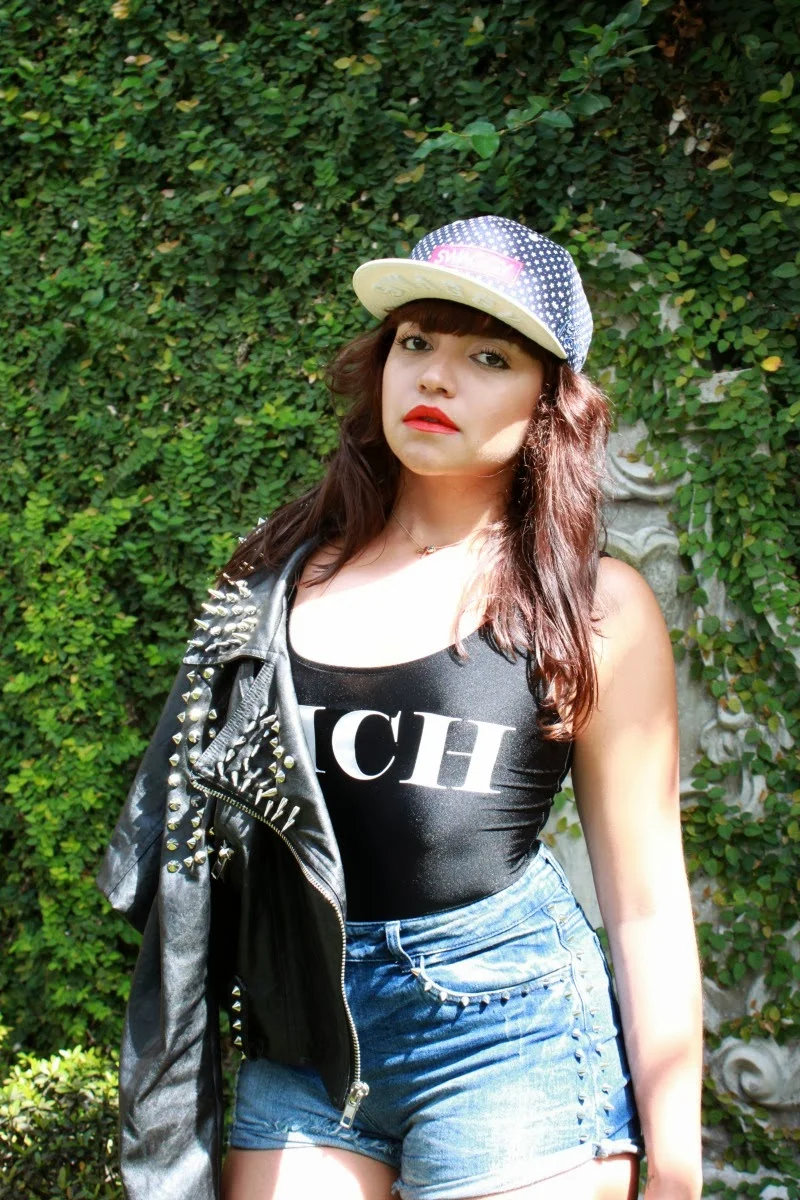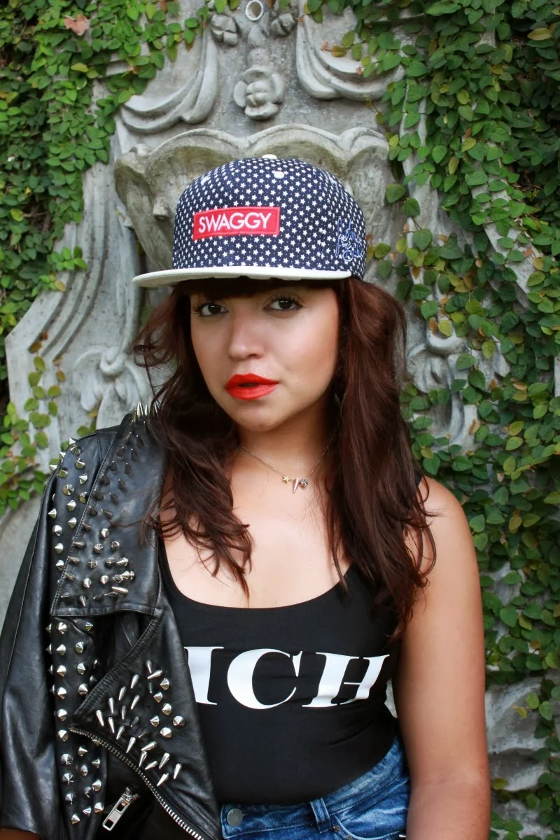 Para mí es muy difícil encontrar shorts a la moda porque tengo piernas muy fuertes (estoy trabajando en bajarlas y definirlas más), por lo que Forever XXI es mi salvación. Inicié comprando este modelo con spikes a los lados, que además de ser muy cómodo, es muy versatil. A juego con el short usé lo que más me gusto de mis compras en la tienda, un body estilo Rihanna con la palabra RICH escrita en blanco. Tengo una fascinación por los enterizos y corsés, ¿que más puedo pedir?. Esto lo usé con mi popular y siempre fiel jacket de cuero con spikes y mi gorra de Justin Bieber. Si, como lo leíste, esta gorra la compré en el concierto de Justin Bieber.
