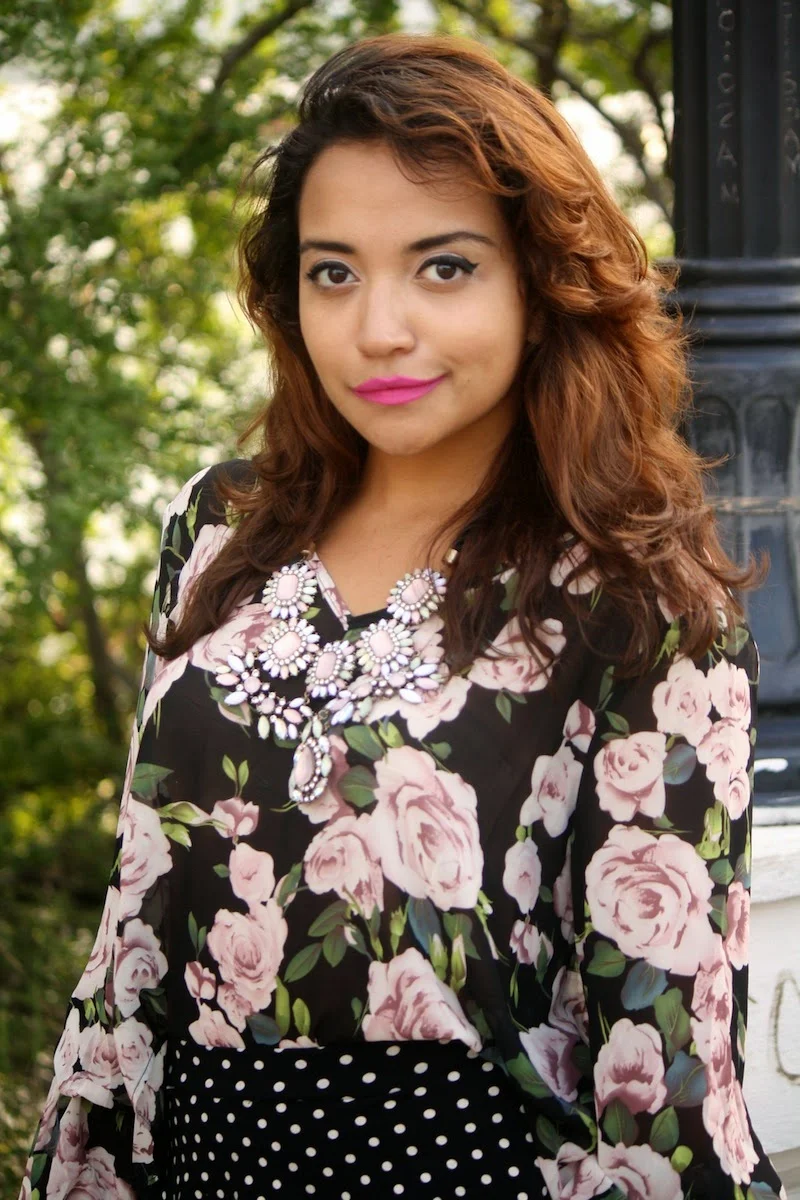 Una vez más aparece mi falda de lunares, esta vez combinada con mi nueva blusa favorita: rosas y mangas de pirata, ¿se puede pedir algo más a la vida? Como siempre les comento, parte fundamental de lograr una combinación MIKS AND MATSH como esta es tener cierto tipo de armonía en las prendas. En este caso este elemento se lo dio el color negro que es base de los lunares y de las rosas.